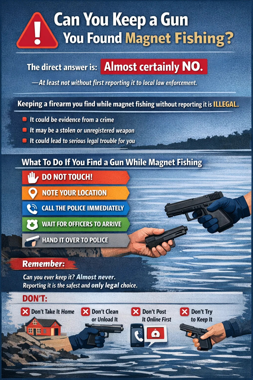 La réponse courte est : presque certainement non – du moins pas sans le signaler au préalable aux forces de l’ordre locales. Dans la plupart des États américains, ainsi qu'au Royaume-Uni, au Canada et en Australie, il est illégal de conserver une arme à feu que vous avez sortie de l'eau avec un aimant de pêche sans la signaler. L'arme peut être une preuve d'un crime, avoir été déclarée volée ou être une arme non enregistrée, ce qui crée pour vous une grave exposition juridique au moment où vous décidez de repartir avec elle.