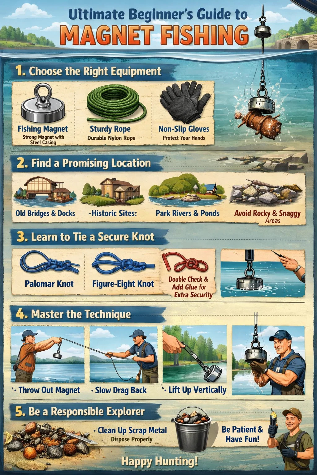 Essayer la pêche à l’aimant est en réalité très simple ; vous n'avez besoin d'aucune connaissance avancée en physique ni d'une force exceptionnelle. Tant que vous êtes curieux du monde sous-marin, vous pouvez facilement commencer en suivant ces étapes :