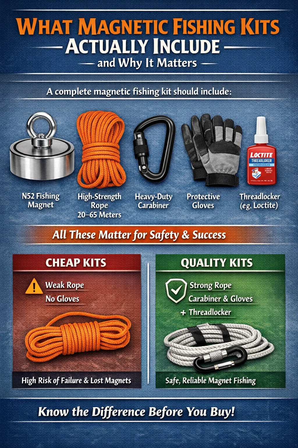 Si vous cherchez une réponse simple : un kit de pêche magnétique complet comprend un aimant de pêche en néodyme, une corde à haute résistance (généralement de 20 à 65 mètres), un mousqueton à verrouillage, des gants de protection et souvent un composé frein-fil comme le Loctite. Ensemble, ces éléments déterminent si votre expérience de pêche à l’aimant est productive et sûre – ou frustrante et dangereuse. Les kits bon marché qui sautent des gants ou utilisent une corde de mauvaise qualité sont responsables de la majorité des accidents et des pertes d'aimants signalés dans les communautés de pêche aux aimants en ligne.