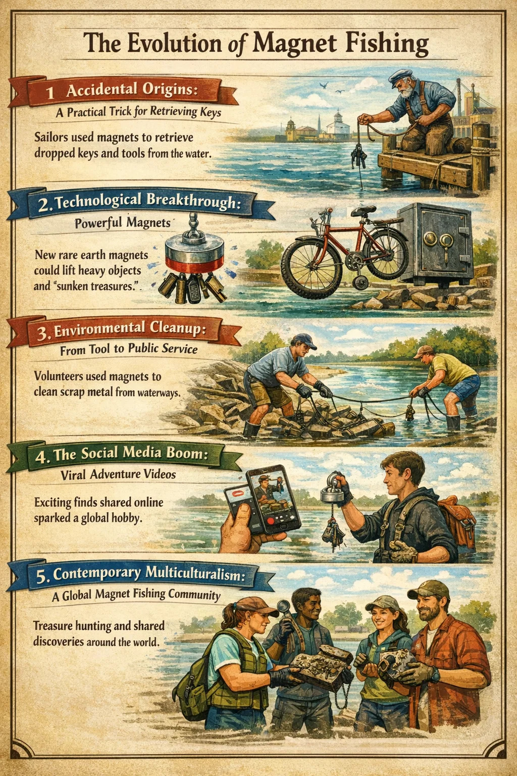 Communauté mondiale : de nos jours, il existe des communautés dédiées partout dans le monde où les gens partagent leurs conseils en matière d'équipement et leurs dernières découvertes, transformant la pêche à l'aimant d'un outil de niche en un lien reliant les gens avec la nature et l'histoire.