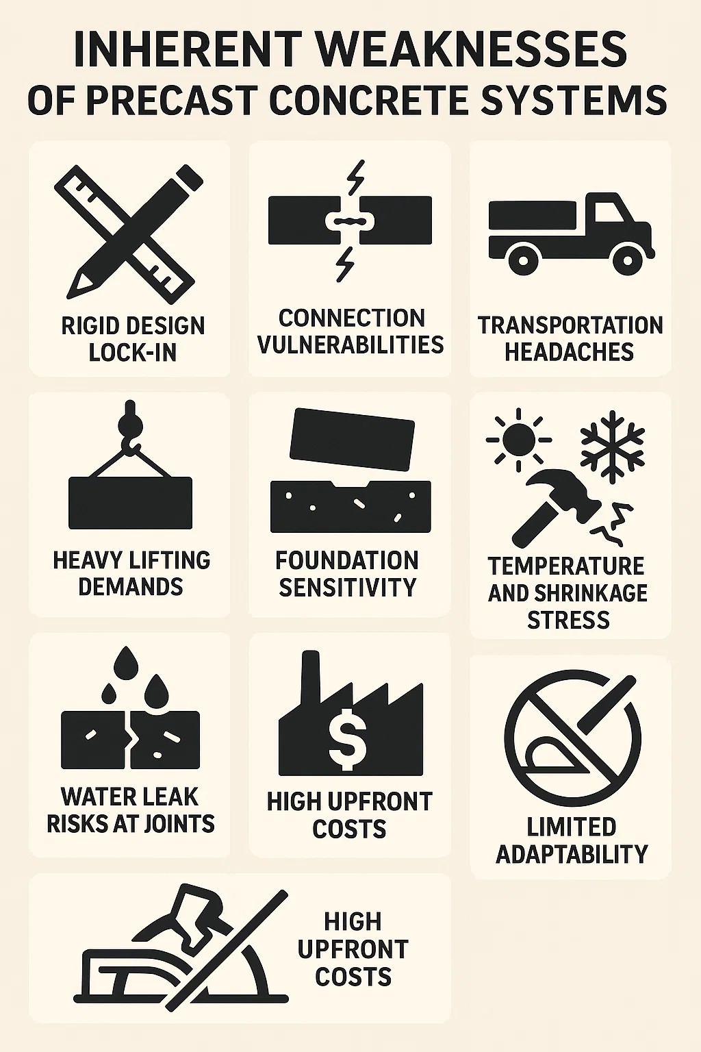 Voici les faiblesses inhérentes à systèmes en béton préfabriqué :
