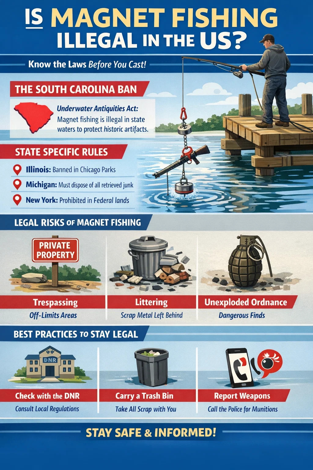 La pêche à l'aimant est pas illégal au niveau fédéral aux États-Unis, mais il est strictement réglementé ou carrément interdit dans certains États, villes et juridictions. L'interdiction la plus notable concerne Caroline du Sud , où la loi sur les antiquités sous-marines interdit l'utilisation d'un aimant de pêche pour collecter des artefacts dans les eaux de l'État. Dans d'autres États, la légalité dépend des lois locales sur les intrusions, des protections environnementales et des mandats du Département des ressources naturelles (DNR).